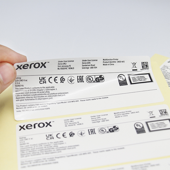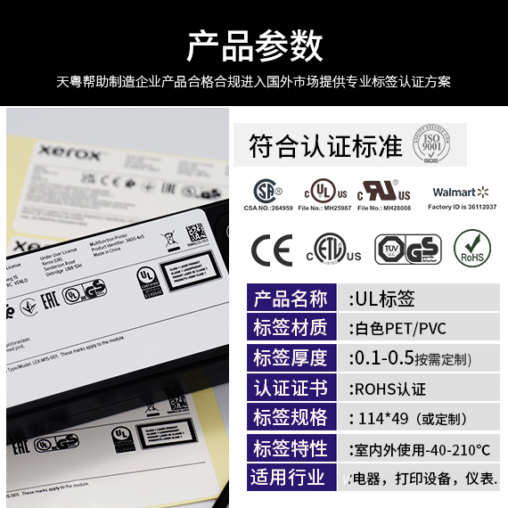 英国UKCA认证标签 EAC打印机设备铭牌 天粤通过UL969标准