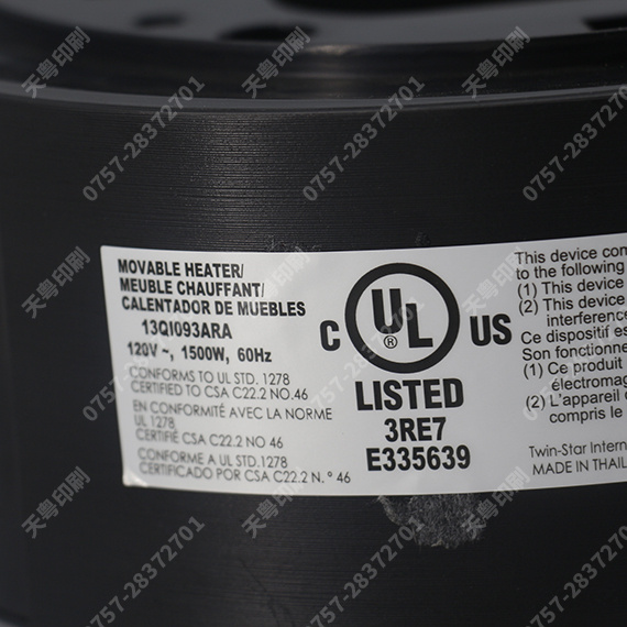 符合UL标准1278家具加热器UL标贴|不干胶ul哑银标签|防水耐高温150℃贴纸|条形码标签