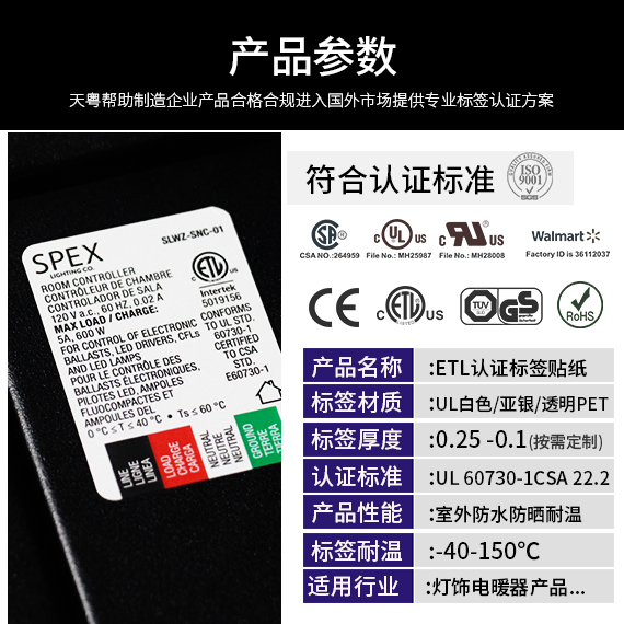 卷装用出口标签 北美电气产品ETL铭牌认证